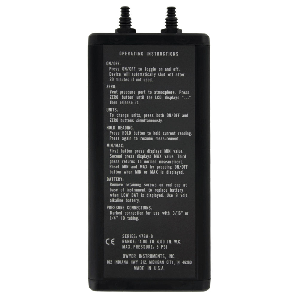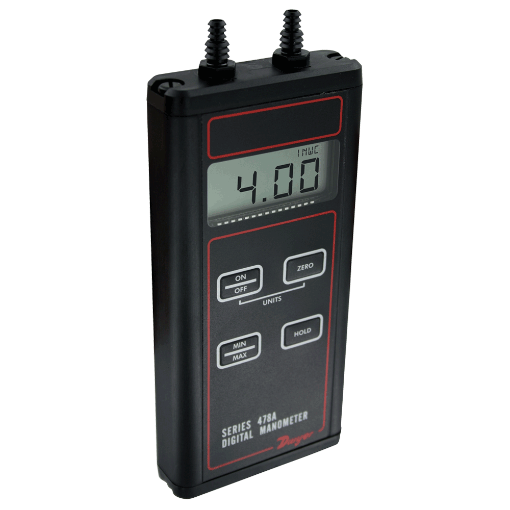 The Series 476A Single Pressure Differential Pressure Digital Manometer can be used to measure low pressures from -20 to 20 in w.c. with ±1.5% FS accuracy. The Series 478A Single Pressure Differential Pressure Digital Manometer can be used to measure positive, negative, or differential pressures with ±1.5% full-scale accuracy. Both units are constructed of an extruded aluminum case for exceptional durability.