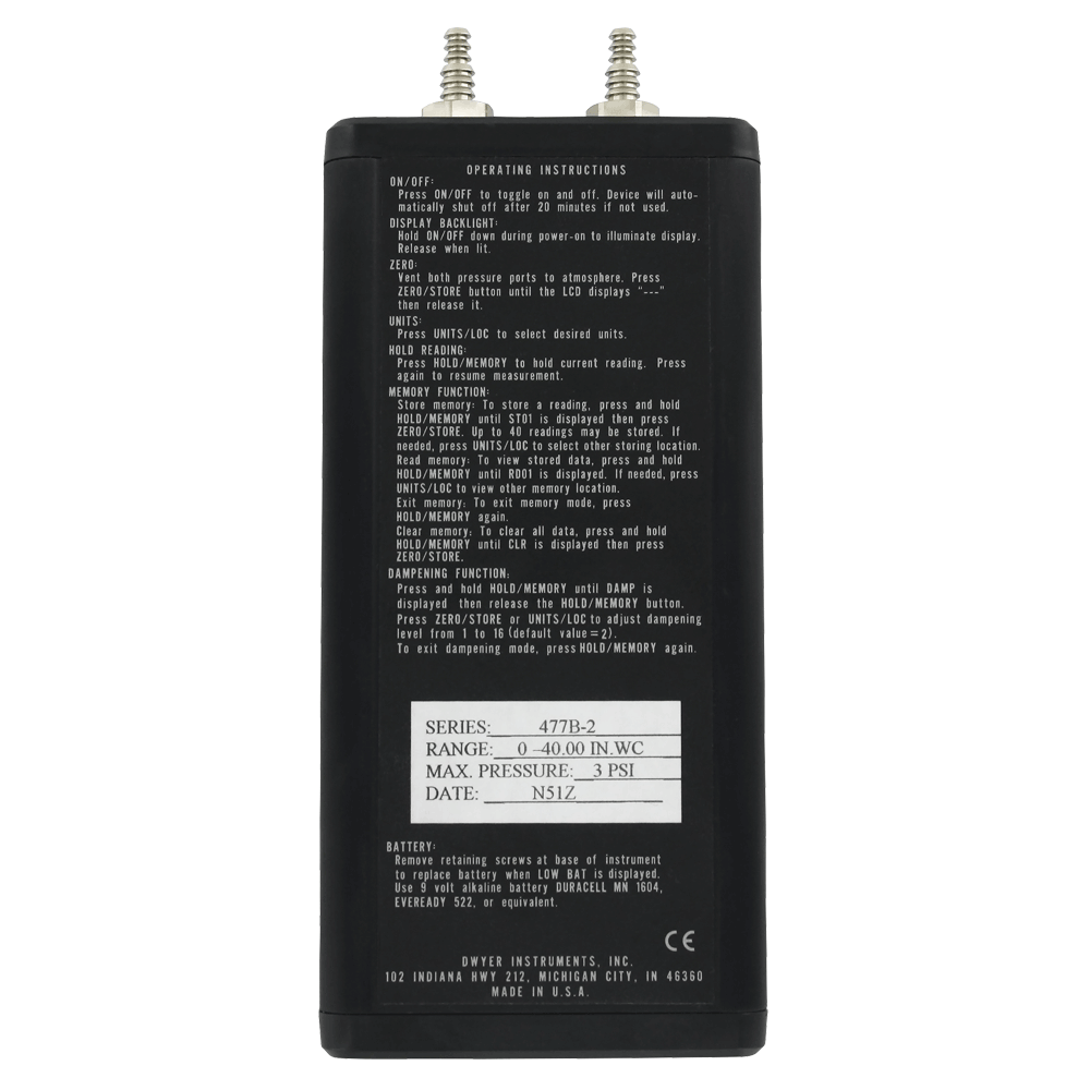 The Series 477B Handheld Digital Manometers are versatile, hand-held, battery operated manometers available in several basic ranges from 0-20 in w.c. up to 100 psi. All models measure either positive, negative or differential pressures with ±0.10% of full scale accuracy. You can select from up to seven common English and metric pressure units so conversions are not necessary. A memory function allows storage of up to 40 readings for later recall and a backlight provides auxiliary lighting for hard-to-see locations. Also standard is a hold feature; plus both visual and audible overpressure alarms.